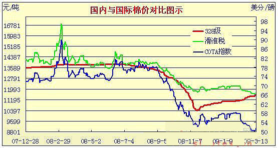09年2月2日-09年3月13日國內(nèi)外棉價對比圖表