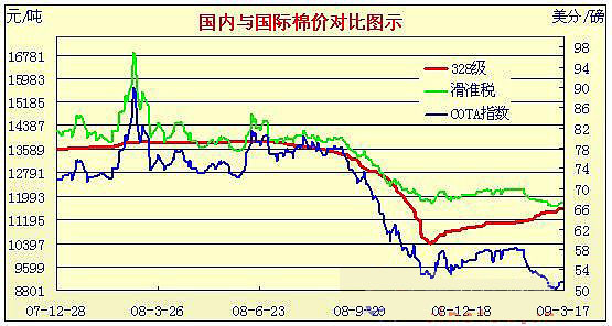 09年2月2日-09年3月17日國(guó)內(nèi)外棉價(jià)對(duì)比圖表