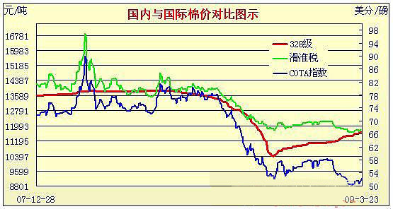 09年2月2日-09年3月23日國內(nèi)外棉價(jià)對比圖表