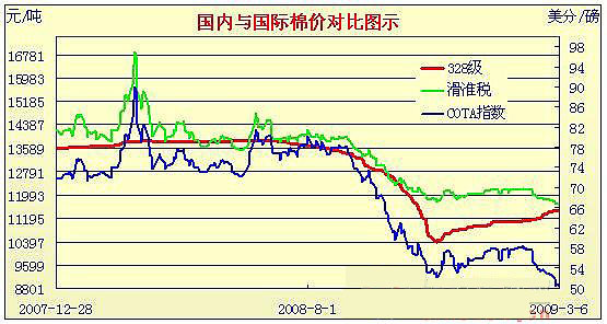 09年2月2日-09年3月6日國內(nèi)外棉價對比圖表