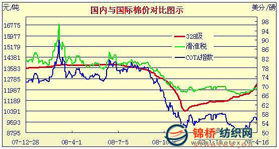 錦橋紡織網(wǎng)—資訊頻道> 棉花信息> cotlook>正文 09年3月2日-09年4月16日國內外棉價對比圖表