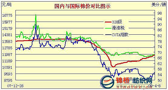 錦橋紡織網(wǎng)—資訊頻道> 棉花信息> cotlook>正文 09年3月2日-09年4月8日國內(nèi)外棉價對比圖表