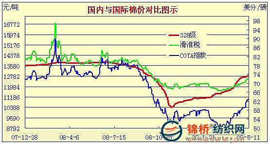 錦橋紡織網(wǎng)—資訊頻道> 棉花信息> cotlook>正文 09年3月2日-09年5月11日國內(nèi)外棉價對比圖表