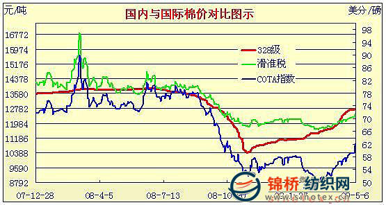 錦橋紡織網(wǎng)—資訊頻道> 棉花信息> cotlook>正文 09年3月2日-09年5月6日國內(nèi)外棉價對比圖表