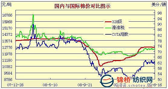 錦橋紡織網(wǎng)—資訊頻道> 棉花信息> cotlook>正文 09年3月2日-09年6月16日國內外棉價對比圖表