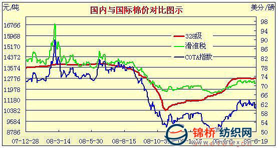 錦橋紡織網(wǎng)—資訊頻道> 棉花信息> cotlook>正文 09年3月2日-09年6月19日國內外棉價對比圖表