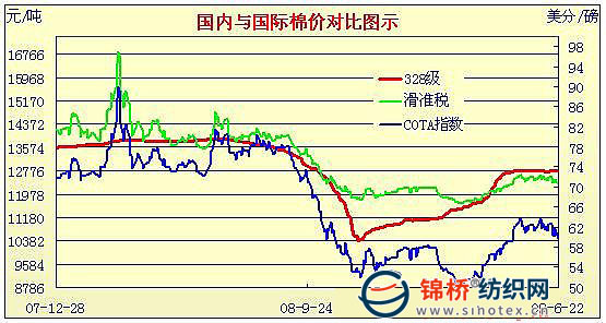 錦橋紡織網(wǎng)—資訊頻道> 棉花信息> cotlook>正文 09年3月2日-09年6月22日國內(nèi)外棉價對比圖表
