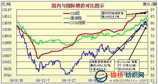 錦橋紡織網(wǎng)—資訊頻道> 棉花信息> cotlook>正文 國內(nèi)外棉價對比圖表(12.31-1.11)