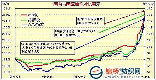 錦橋紡織網(wǎng)—資訊頻道> 棉花信息> cotlook>正文 國內(nèi)外棉價對比圖表(10.15-11.11)