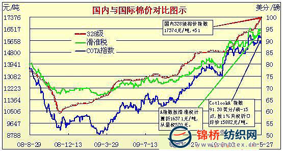 錦橋紡織網(wǎng)—資訊頻道> 棉花信息> cotlook>正文 國內(nèi)外棉價對比圖表(4.30-5.27)