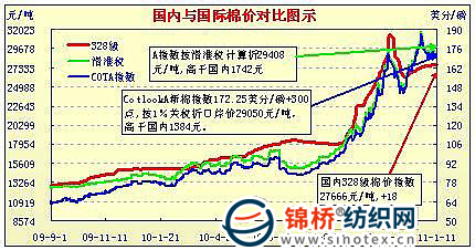錦橋紡織網(wǎng)—資訊頻道> 棉花信息> cotlook>正文 國內(nèi)外棉價對比圖表(12.20-1.11)