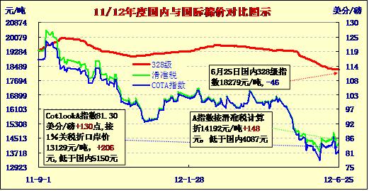 國(guó)內(nèi)外棉價(jià)對(duì)比圖表(6-25)