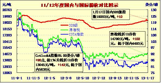國內(nèi)外棉價(jià)對比圖表(13-1-17)