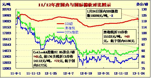 國內(nèi)外棉價(jià)對(duì)比圖表(13-1-24)
