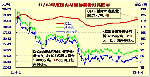 注:2013年,計算進口棉滑準(zhǔn)稅的兩個常數(shù)調(diào)整(即常數(shù)Pt由8.23提高到8.87;另一常數(shù)由3.235%下調(diào)至2.908%)后,滑準(zhǔn)稅折口岸價大幅上升,在價格、匯率等條件同等情況下,滑準(zhǔn)稅折口岸價平均每噸提高200元左右,計算方法本身縮小了滑準(zhǔn)稅的內(nèi)外棉價差,同時,這一提價因素當(dāng)由進口企業(yè)買單。