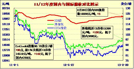 國(guó)內(nèi)外棉價(jià)對(duì)比圖表(13-2-20)
