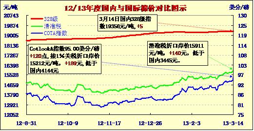 國內(nèi)外棉價(jià)對(duì)比圖表(13-3-14)