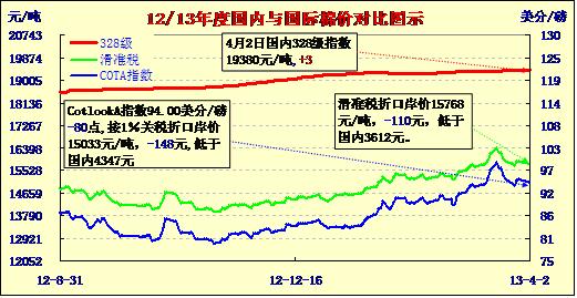 國內(nèi)外棉價(jià)對比圖表(13-4-2)