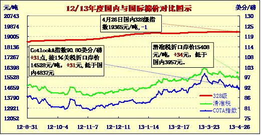 國(guó)內(nèi)外棉價(jià)對(duì)比圖表(13-4-26)