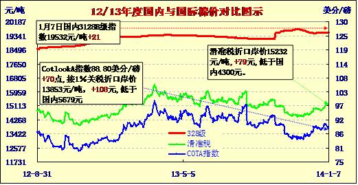 錦橋紡織網(wǎng)—資訊頻道> 棉花信息> cotlook>正文 國(guó)內(nèi)外棉價(jià)對(duì)比圖表(01-07)