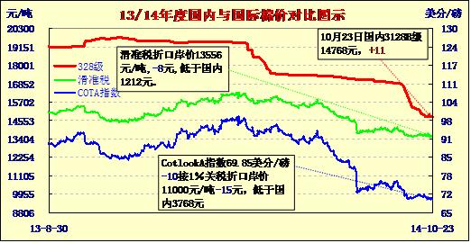 錦橋紡織網(wǎng)—資訊頻道> 棉花信息> cotlook>正文 國內(nèi)外棉價對比圖表(10-23)