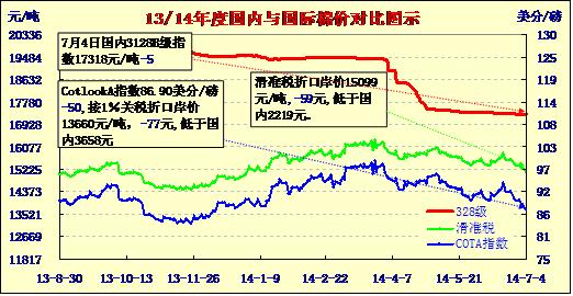 國(guó)內(nèi)外棉價(jià)對(duì)比圖表(07-04)