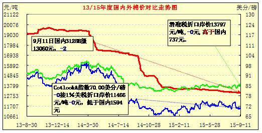 由于匯率由8月份的6.1152調(diào)到9月份的6.3963,貶值4.4%,進(jìn)口棉成本提高2-4.5%,即按1%關(guān)稅折進(jìn)口價(jià)提高近500元/噸,近滑準(zhǔn)稅彌提高250元/噸左右,內(nèi)外價(jià)差再度大幅縮小。