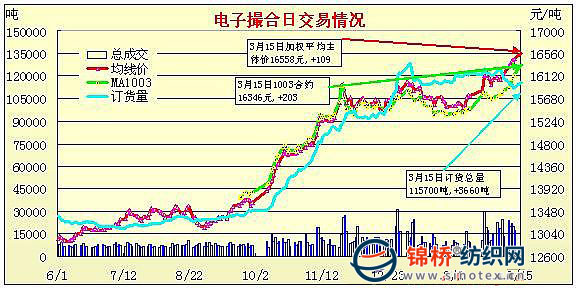 錦橋紡織網(wǎng)—資訊頻道> 棉花信息> 電子撮合>正文 電子撮合受現(xiàn)貨影響大幅收漲(3-15)