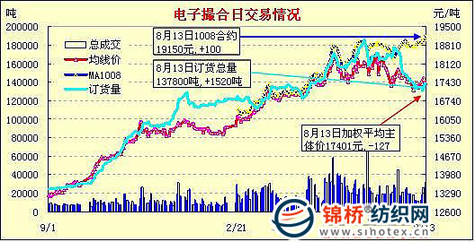 錦橋紡織網(wǎng)—資訊頻道> 棉花信息> 電子撮合>正文 電子撮合全線上漲8月合約達(dá)19150元(8-13)
