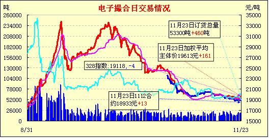 11月23日,全國(guó)棉花交易市場(chǎng)商品棉電子撮合交易成交17100噸,較上一日減少2140噸,訂貨量增加460噸,累計(jì)訂貨53300噸。各合同開(kāi)盤近低遠(yuǎn)高,而之后行情走勢(shì)則表現(xiàn)相反,近月合同震蕩上行,中遠(yuǎn)月合同則普遍高開(kāi)低走,弱勢(shì)震蕩為主,收市時(shí)各合同均價(jià)跌多漲少,幅度均不足30元;近月MA1112合同收于18965元,漲45元,主力MA1204合同收于19670元,跌20元;盤內(nèi)最低價(jià)為MA1112合同開(kāi)市價(jià)18900元,最高價(jià)為MA1205合同盤中價(jià)20300元;當(dāng)日成交量略增,訂貨量大增。