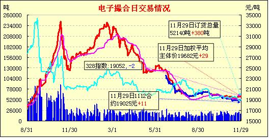 11月29日,全國棉花交易市場商品棉電子撮合交易成交17380噸,較上一日減少180噸,訂貨量增加380噸,累計(jì)訂貨52140噸。撮合開盤近低遠(yuǎn)高,之后行情震蕩居多,漲跌交替,尾盤各合同均呈現(xiàn)漲勢,收市時各合同均價普遍小幅收漲;近月MA1112合同收于19050元,漲36元,主力MA1204合同收于19700元,漲12元;盤內(nèi)最低價為MA1112合同開市價19000元,最高價為MA1205合同開市價和收市價19850元;當(dāng)日成交量略減,訂貨量繼續(xù)增加。