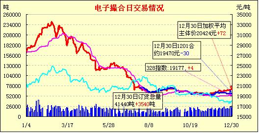 12月30日,全國棉花交易市場商品棉電子撮合交易成交27340噸,較上一日增加5340噸,訂貨量增加3540噸,累計訂貨41440噸。今日撮合低開居多,之后行情與昨日均價附近震蕩為主,尾盤行情普遍走低,收市時各合同均價小幅漲跌;近月MA1201合同收于19470元,跌30元,主力MA1205合同收于20455元,跌67元;盤內(nèi)最低價為MA1201合同19470元,最高價為MA1206合同盤中價20825元;當日成交量續(xù)增,訂貨量大增。