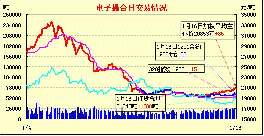 1月16日,全國棉花交易市場商品棉電子撮合交易成交21480噸,較上一日增加1080噸,訂貨量增加1500噸,累計訂貨51040噸。今日撮合普遍低開,之后行情普遍低位回漲,與前一日均價附近震蕩,尾盤全面呈現(xiàn)弱勢,收市時各合同均價全面收跌,跌幅均在百元以內(nèi);近月MA1201合同收于19610元,跌96元,主力MA1205合同收于20945元,跌50元;盤內(nèi)最低價為MA1201合同收市價19610元,最高價為MA1206合同盤中價21140元;當日成交量增加,訂貨量續(xù)增。