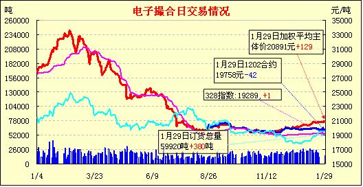1月29日,全國(guó)棉花交易市場(chǎng)商品棉電子撮合交易成交14560噸,較上一日增加1820噸,訂貨量增加380噸,累計(jì)訂貨59920噸。節(jié)后首日撮合多數(shù)合同低開,基本在上午10點(diǎn)左右陸續(xù)開始成交,之后行情低位回暖,于收市前曾有一波沖高走勢(shì)但相對(duì)短暫,盤終各合同均價(jià)跌多漲少;近月MA1202合同收于19660元,跌140元,MA1205合同收于20990元,跌48元;盤內(nèi)最低價(jià)為MA1202合同開市價(jià)19560元,最高價(jià)為MA1207合同盤中價(jià)21600元;當(dāng)日成交量有所增加,訂貨量續(xù)增。