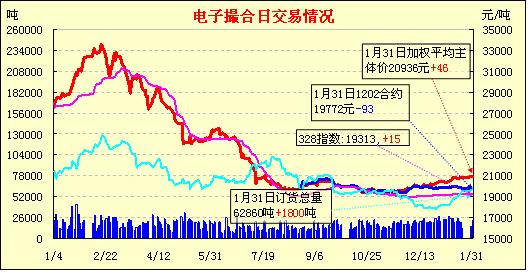 1月31日,全國(guó)棉花交易市場(chǎng)商品棉電子撮合交易成交22520噸,較上一日增加10700噸,訂貨量增加1800噸,累計(jì)訂貨62860噸。今日撮合在昨日上漲后略有回調(diào),近期MA1202合同低開低走,收于19795元,跌10元,MA1203、MA1204合同盤中震蕩明顯,MA1205、MA1206合同盤中上漲趨勢(shì)明顯。盤內(nèi)最低價(jià)為MA1202合同19620元,最高價(jià)為MA1206合同21230元;當(dāng)日成交量訂貨量繼續(xù)增加。