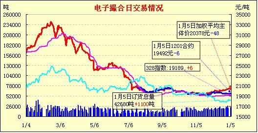 1月5日,全國棉花交易市場商品棉電子撮合交易成交21800噸,較上一日減少1920噸,訂貨量增加1100噸,累計(jì)訂貨42680噸。今日撮合開盤近低遠(yuǎn)高,之后行情震蕩回落,部分合同表現(xiàn)弱勢,尾盤中遠(yuǎn)月合同普遍再現(xiàn)漲勢,收市時(shí)各合同均價(jià)小幅漲跌;近月MA1201合同收于19495元,跌3元,主力MA1205合同收于20575元,漲22元;盤內(nèi)最低價(jià)為MA1201合同開市價(jià)19490元,最高價(jià)為MA1206合同盤中價(jià)20795元;當(dāng)日成交量有所減少,訂貨量續(xù)增。