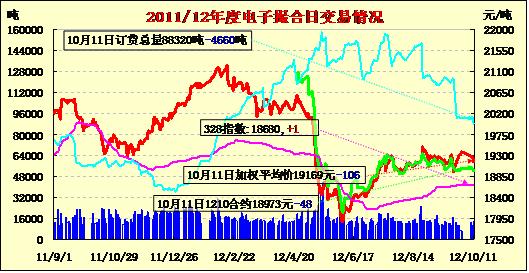 10月11日撮合市場量增倉減,均價續(xù)跌。各合同開盤互有高低,日內(nèi)弱勢震蕩,終盤收跌。當日MA1212合同均價跌74元/噸,跌幅最大,其他各合同分別下跌35至62元/噸不等。交易總成交13620噸,較上一交易日增加3400噸,訂貨量減少4660噸,累計訂貨88320噸。由于近期以來全球經(jīng)濟增長遲緩,同時歐債危機的徹底化解仍然遙遙無期,原本作為全球經(jīng)濟發(fā)動機的新興經(jīng)濟體經(jīng)濟增速也顯露頹勢,目前市場各方多對后期經(jīng)濟走勢持悲觀態(tài)度。目前棉花現(xiàn)貨市場交投雖繼續(xù)疲弱,但由收儲的政策性保護,棉價繼續(xù)保持相對平穩(wěn)。