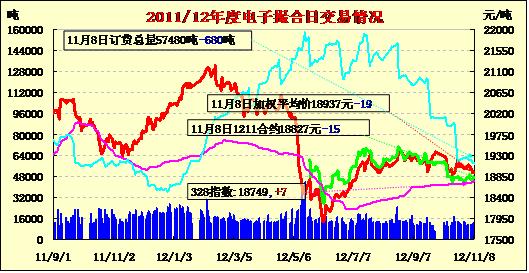 11月8日撮合市場量增倉減,均價收跌。各合同開盤高低不一,日內(nèi)寬幅震蕩,終盤收跌。其中遠月合同總體跌幅大于近月合同, 各合同跌9—68元/噸不等。交易成交12720噸,較上一交易日增340噸,訂貨量減680噸,累計訂貨57480噸?;久嫔希壳坝《?、美國新棉陸續(xù)大量上市,市場供應壓力進一步增強,內(nèi)外棉巨大的價差繼續(xù)抑制中國出口與消費,同時新年度進口政策不確定性使得買家觀望情緒較濃,購買興趣也僅限于近期需求,且往往有價無市,成交情況極為清淡。