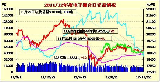 11月22日撮合市場倉量減少,漲跌互現(xiàn)。各合同開盤高低不一,日內(nèi)寬幅震蕩,終盤漲跌互現(xiàn)。當(dāng)日MA1212、MA1301和MMA1304分別漲43元/噸、29元/噸和35元/噸;MA1302和MA1303分別跌15元/噸和37元/噸;MA1305首日平均價為19127元/噸。交易總成交10140噸,較上一交易日減2200噸,訂貨量減少160噸,累計訂貨39180噸。近期港口部分棉商急于銷售意愿較強(qiáng),因急于回籠資金等待新花的到港,但紡織企業(yè)利潤不佳且產(chǎn)品出售緩慢,其對棉花心里價位偏低,壓價意愿較強(qiáng),交易成交情況一般。地產(chǎn)棉價格仍小幅穩(wěn)步上升,且市場流通的可用資源幾乎為陳棉,存在一定質(zhì)量問題,況且價格偏高,導(dǎo)致成交總體較為清淡。