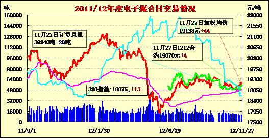 11月27日撮合市場高開震蕩收漲,三連小陽。當日除MA1305合同無成交價格不變外,其他合同價格均有不同程度的上漲,漲4—64元/噸不等。交易總成交10300噸,較上一交易日減380噸,訂貨量減20噸,累計訂貨39240噸?;久嫔希刂林芤恢袊諆σ堰_到326萬噸,國產(chǎn)棉供應(yīng)將因此趨緊?,F(xiàn)貨價格繼續(xù)緩慢上漲,紡織企業(yè)迫于近期需求,在沒有配額及合適的外棉的情況下,只得用國內(nèi)高價棉來維持生產(chǎn)需要,現(xiàn)貨成交情況略顯好轉(zhuǎn)。但紡織企業(yè)經(jīng)營狀況沒有改善,資金緊張、產(chǎn)品銷售不佳、對后市信心不足將繼續(xù)影響棉花需求。