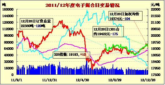 12月28日,撮合市場各合同低開,震蕩下行,終盤收跌。當日除了MA1306因無成交價格不變外,其余合同價格減94—175元/噸不等。其中近月MA1301合同減175元/噸,減幅最大。交易總成交11100噸,較上一交易日增760噸。訂貨量減120噸,累計訂貨22380噸。因市場預期國家將出臺政策,紡織企業(yè)采購原料較為謹慎,雖說市場現(xiàn)貨價格上漲,但基本無成交。而與此同時,因進口配額即將發(fā)放的緣故,港口外棉到港量漸多,貿(mào)易商進貨較為積極。