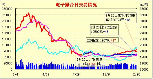 2月20日,全國棉花交易市場商品棉電子撮合交易成交15360噸,較上一日減少1820噸,訂貨量增加1440噸,累計(jì)訂貨93100噸。今日撮合開盤依然存在分歧,各合同高低不一,之后行情整體走勢震蕩下行,盤終各合同仍呈現(xiàn)跌勢,近月合同跌幅明顯,收市時(shí)各合同均價(jià)跌多漲少,幅度均在50元以內(nèi);近月MA1202合同收于19400元,跌235元,主力MA1205合同收于20760元,跌45元;盤內(nèi)最低價(jià)為MA1202合同收市價(jià)19400元,最高價(jià)為MA1207合同盤中價(jià)21225元;當(dāng)日成交量萎縮,訂貨量增加。