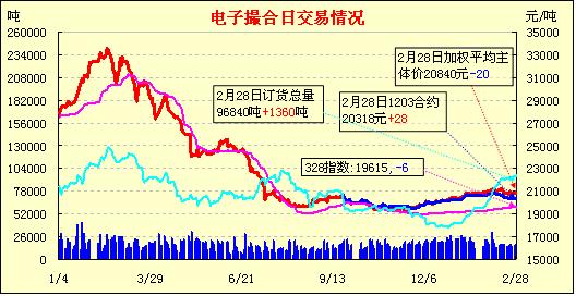 2月28日,全國(guó)棉花交易市場(chǎng)商品棉電子撮合交易成交16780噸,較上一日增加620噸,訂貨量增加1360噸,累計(jì)訂貨96840噸。今日撮合各合同仍高開(kāi)居多,之后中遠(yuǎn)月合同行情呈現(xiàn)震蕩上行之勢(shì),尾盤(pán)僅遠(yuǎn)月合同表現(xiàn)弱勢(shì),收市時(shí)各合同均價(jià)漲多跌少,幅度均在百元以?xún)?nèi);近月MA1203合同收于20300元,漲10元,主力MA1205合同收于20755元,漲90元;盤(pán)內(nèi)最低價(jià)為MA1203合同盤(pán)中價(jià)20290元,最高價(jià)為MA1208合同開(kāi)市價(jià)21220元;當(dāng)日成交量小增,訂貨量續(xù)增。