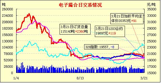 3月21日,全國棉花交易市場商品棉電子撮合交易成交13680噸,較上一日減少1800噸,訂貨量增加2360噸,累計訂貨115140噸。今日MA各月合同均價繼續(xù)反彈,其中MA1203合同均價漲幅119成為當日漲幅最大合同,MA1207漲幅10元為當日漲幅最小合同;其余合同均價漲幅在19-37元之間;技術弱勢有反彈苗頭,但目前市場仍缺乏基本面的利多配合,底部反轉(zhuǎn)特征有待進一步確認。