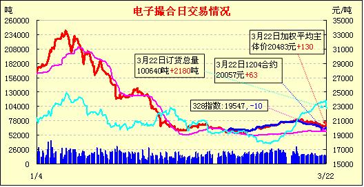 3月22日,全國棉花交易市場商品棉電子撮合交易成交14520噸,較上一日增加840噸,訂貨量增加2180噸,累計訂貨100640噸。今日MA各月合同均價繼續(xù)小漲,其中MA1204合同均價漲幅63成為當日漲幅最大合同,MA1205漲幅41元為當日漲幅最小合同;其余合同均價漲幅在42-62元之間;盤面上看均線的反彈苗頭雖繼續(xù)受基本面利空因素壓力,但近期市場上高等級棉的稀缺,或將激發(fā)企業(yè)買盤在撮合市場獲取優(yōu)質貨源倉單,從而提振撮合市場價格與現(xiàn)貨價格的接軌。
