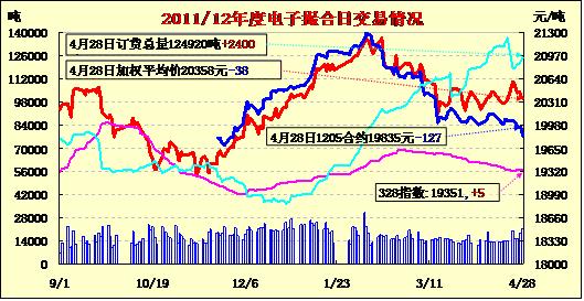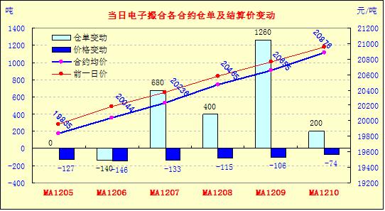 4月28日,量倉續(xù)增,均價(jià)大跌。今日撮合開盤高低不一,盤中震蕩走低,盤終大幅收跌;當(dāng)日MA1208合同大幅下跌325元,其他合同跌幅在232-320元之間。撮合交易總成交21160噸,較上一日增加2780噸,訂貨量增加2400噸,累計(jì)訂貨量124920噸?;久嫔?,由于西班牙債務(wù)未出現(xiàn)實(shí)質(zhì)性利空,美聯(lián)儲(chǔ)仍把QE3作為貨幣政策保留選項(xiàng),短期內(nèi)美元難以持續(xù)走強(qiáng)。節(jié)前期貨市場再次傳出好消息,自6月1日起國內(nèi)四大期貨交易所將大幅下調(diào)交易手續(xù)費(fèi),此舉將令市場資金流動(dòng)性增強(qiáng)。