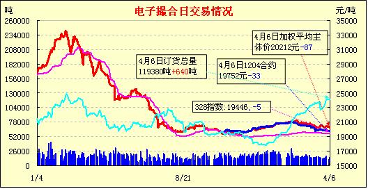 4月6日,全國棉花交易市場商品棉撮合交易成交14440噸,較上一日增加2840噸,訂貨量增加640噸,累計訂貨量119380噸。今日撮合合同除近月MA1204和遠月MA1209合同低開外,其他合同均高開,盤中震蕩上行,終盤收漲;近月MA1204合同漲幅最小僅為5元,其他合同漲幅在35-45元之間。基本面上,外圍ICE期棉連續(xù)六天報跌,彰顯宏觀形勢和消費需求不振;國內(nèi)現(xiàn)貨市場的消費疲軟亦令撮合交易市場近期持續(xù)偏弱;日前市場猜測4月份棉花市場將繼續(xù)受配額和拋儲壓力,在今日的蘇州“2012’中國棉花貿(mào)易洽談會”各方傳達的信號看,市場繼續(xù)保持平穩(wěn)運行將是主基調(diào)。