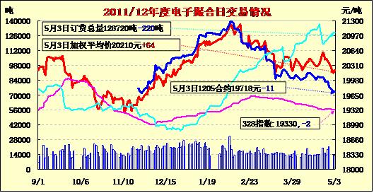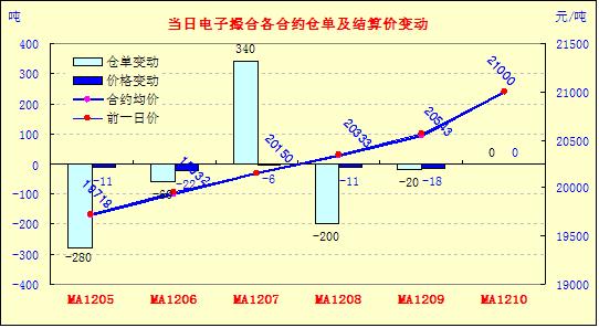 5月3日電撮量倉均縮,均價(jià)續(xù)跌。撮合開盤大多低開,盤中弱勢震蕩,盤終收跌;當(dāng)日遠(yuǎn)月MA1210合同全天無成交,MA1206合同收盤報(bào)跌84元為當(dāng)?shù)刈畲蟮贤?,其他合同跌幅?4-74元之間。撮合交易總成交12940噸,較上一日減少100噸,訂貨量減少220噸,累計(jì)訂貨量128720噸?;久嫔?,市場近幾日交集傳聞信息較多,多空雙方均保持觀望態(tài)勢。受廣交會廣東當(dāng)?shù)赜唵斡兴黾佑绊?,有業(yè)內(nèi)人士稱,國內(nèi)某大型紡織企業(yè)近日銷往廣東地區(qū)的紗價(jià)有大幅提高,但此消息仍未得到企業(yè)確切答復(fù)。目前來看,市場整體的觀望情緒仍濃厚,市場多在靜待配額政策的后續(xù)指引。