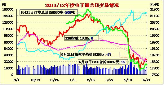 6月21日,撮合各合同全面低開,之后除近月合同相對(duì)堅(jiān)挺外,其余合同均低位震蕩,收市時(shí)各合同均價(jià)全面下跌,跌幅多在百元以上;近月MA1206合同收于18070元,跌79元,主力MA1209合同收于18385元,跌236元;盤內(nèi)最低價(jià)為MA1206合同盤中價(jià)18000元,最高價(jià)為MA1211合同開市價(jià)18845元;當(dāng)日成交量下降,訂貨量減少。交易總成交11900噸,較上一日減少5220噸,訂貨量減少500噸,累計(jì)訂貨150080噸。