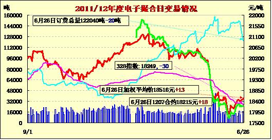6月26日撮合交易量倉均減,近強遠弱。在外棉的強勢小幅提振情況下,今日撮合市場早盤高開,但因國內(nèi)市場整體對未來消費的不樂觀,盤中沖高回落,終盤收跌。MA1208合同上漲36元為當(dāng)日漲幅最大合同,MA1212下跌21元,為當(dāng)日跌幅最大合同。交易總成交13360噸,較上一日減少3480噸,訂貨量減少20噸,累計訂貨122040噸?;久嫔?,美國農(nóng)業(yè)部將于月底公布的美棉實際種植面積是投資者關(guān)注的焦點之一;另外,天氣因素將成為未來一段時間棉價起伏的重要參考信息。